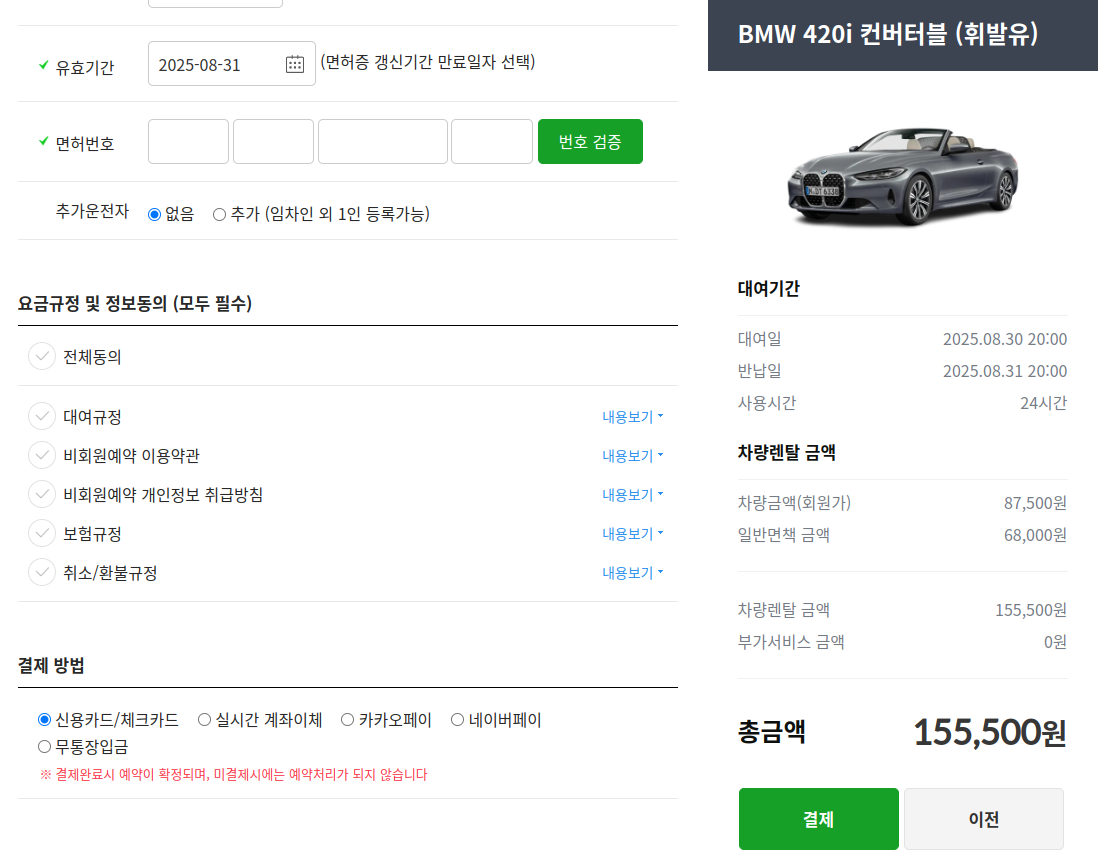 (4) 예약자 정보, 운전자 정보 입력 후 결제합니다